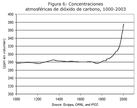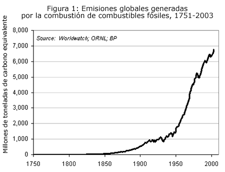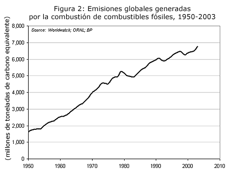 En el 2003 las emisiones de carbono procedentes de combustibles fósiles llegaron a un récord histórico de 6.800 millones de toneladas, casi un 4% más que el año anterior. Las emisiones globales de carbono han aumentado de forma constante desde finales del siglo XVIII, y de manera especialmente rápida desde la década de 1950. De hecho, las emisiones anuales se han cuadruplicado desde el 1950.