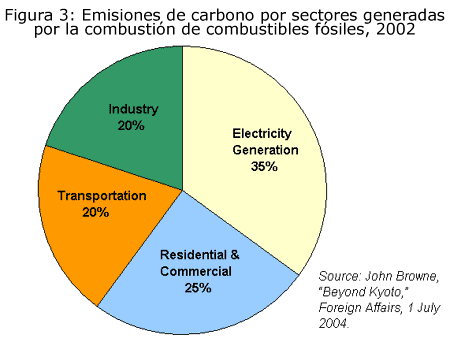 Tres cuartas partes de las emisiones globales de carbono provienen de combustibles fósiles, concretamente del carbono, el petróleo y el gas natural. El resto son, mayoritariamente, consecuencia de la deforestación. De los cuatro principales sectores que contribuyen a estas emisiones, la generación de electricidad es responsable de la mayor parte: un 35%. El transporte y los procesos industriales son responsables de un 20% cada uno, mientras que el 25% restante proviene de edificios residenciales y comerciales (ver la figura 3).
