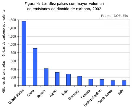 Dos terceras partes de las emisiones de carbono derivadas de los combustibles fósiles tienen su origen en sólo 10 países. Los Estados Unidos de América, con un 5 por ciento de la población mundial, son el principal contribuyente, y son responsables de casi una cuarta parte de las emisiones globales. China se sitúa en segundo lugar, con prácticamente un 14 por ciento. Los otras principales contaminadores son Rusia, Japón, India y Alemania (ver figura 4).