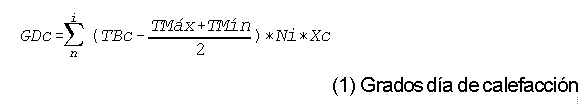 Donde GDc son los grados día de calefacción; Ni el número de días del mes considerado; Tbc es la temperatura base de calefacción (16, 18, 20 y 22C); Tmáx y Tmín son las temperaturas medias mensuales y Xc es un coeficiente lógico que valdrá 1 cuando la temperatura media mensual sea menor a la temperatura base de calefacción.