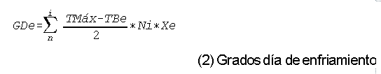 Donde GDe son los grados día de enfriamiento, Ni el número de días del mes considerado, Tbe es la temperatura base de enfriamiento (23, 25 y 27C), Tmáx y Tmín son las temperaturas medias mensuales y Xe es un coeficiente lógico que valdrá 1 cuando la temperatura media mensual sea mayor a la temperatura base de enfriamiento.