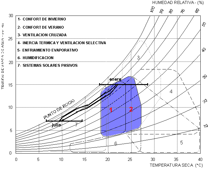 El estudio se localiza en la región del gran La Plata (lat: -35,55° long: 57,56°) a orillas del Río de La Plata sobre la margen occidental. El clima está clasificado según normas argentinas como templado cálido húmedo - subzona IIIb. El comportamiento respecto del confort higrotérmico puede verse en la figura 1 y los datos climáticos medios en la tabla 1. Del análisis de estos datos surge que posee veranos suaves (tmáxmed= 28,5°C) e inviernos poco rigurosos (tmínmed= 6,7°C ) con alta humedad ambiente (HR= 71 y 86%) y vientos predominantes desde el río de baja intensidad.