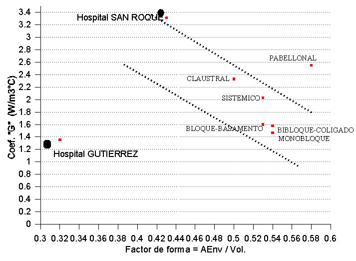 Variación formal de los casos en función del "G" con los tipos ideales: En la Figura 2 se analiza la relación entre el coef. global de pérdidas térmicas "G" y el factor de forma de los casos analizados respecto de los tipos ideales. Vemos que estos hospitales distan mucho de los tipos ideales. En el caso del "San Roque" su situación es particular ya que su factor de forma es bajo para la tipología a que pertenece y posee un coef. "G" alto, en otras palabras es poco compacto y de baja calidad térmica. En contraposición el "Gutiérrez" es bastante menos compacto y posee una mejor calidad térmica global.