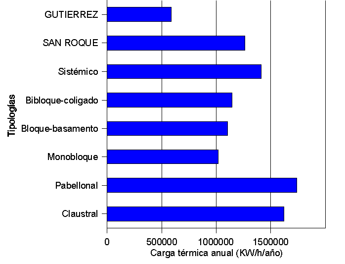 Comportamiento según pérdidas totales: La relación entre las tipologías y la demanda anual de energía en calefacción lleva una relación con el anterior análisis. Una comparación entre los hospitales analizados y las tipologías ideales muestra que la relación entre el "San Roque" y la tipología ideal en la que se encuadra (bloque-basamento), es de solo el 16%; mientras que para el "Gutiérrez" la relación respecto de su tipología ideal (claustral), es del 159%. Esto es significativo más cuando el "San Roque" posee una demanda como carga térmica anual según balance de 1.496 MW/h/año en calefacción, respecto del "Gutiérrez" que solo demanda 518 MW/h/año. Estas diferencias tan marcadas para dos hospitales de complejidad y dimensiones similares es destacable. En estos dos casos la tipología pierde fuerza como variable crítica para ser sustituida por la tecnología-constructiva adoptada. Estas mismas relaciones surgieron en proyectos anteriores cuando se estudió el sector residencial urbano y periurbano, pero la diferencia notable en el análisis es que en aquella situación se contaba con un universo de análisis de más de 300 casos con auditorías detalladas y 2000 casos encuestados. Esta diferencia en la cantidad de casos a manejar permite que puedan extraerse relaciones cuantitativas con un cierto grado de representatividad. En esta situación en que se manejan dos casos, pero complejos por su escala, no pueden extraerse conclusiones representativas de un sector. El avance del proyecto permitirá contar con mayor información y con un instrumental de análisis adaptado a la complejidad del sector.