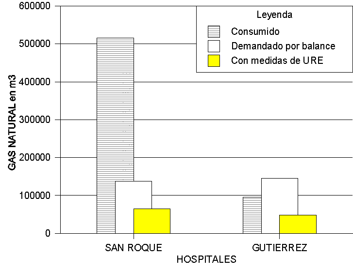 Relación entre energía demandada y consumida: Esta relación graficada en la Figura 3 nos muestra un desequilibrio entre lo calculado por balance y lo realmente consumido. El hospital "San Roque" consume casi tres veces más que lo calculado, esto puede implicar varias cosas: a. que se haya subestimado en demasía el nivel térmico de la envolvente; b. que el nivel de infiltración sea más alto que el estimado que ya es elevado (5 RA/h); c. que el rendimiento del sistema de calefacción sea muy bajo; d. que existan otros consumos no detectados (cocción, lavado, etc); e. que el nivel térmico interior sea elevado; f. que exista sobrefacturación por error de contratación, mal funcionamiento de medidores o hurto; g. o una combinación de todos estos, en diversos grados. En oposición el hospital "Gutiérrez" consume un 30% menos de lo calculado por balance, en este caso es posible que la superficie realmente calefaccionada sea menor a la utilizada en el balance y que el nivel de infiltración sea más bajo que el estimado. En cualquiera de estos casos es conveniente la realización de una auditoria detallada que permita despejar los factores que provocan estos desequilibrios.